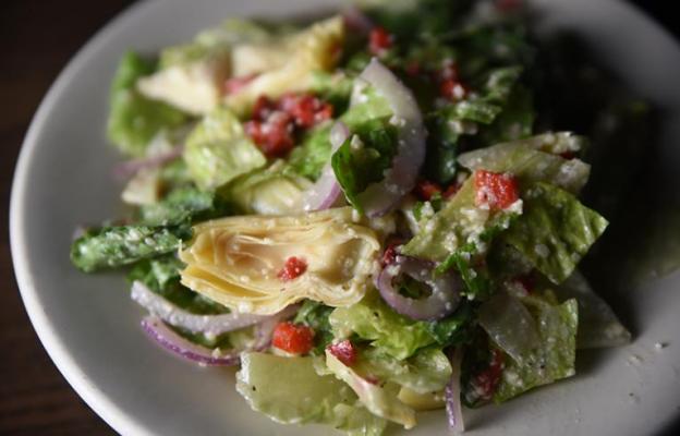 iceberg & romaine lettuce| crushed artichoke hearts| red onion| pimentos| parmigiano| red wine vinegar| olive oil